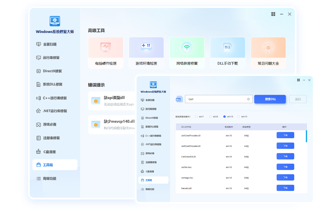 智能修复系统和游戏异常远离各种报错超全系统文件库,智能修复,灵活下载DII文件丢失,各类运行库异常,全能修复
