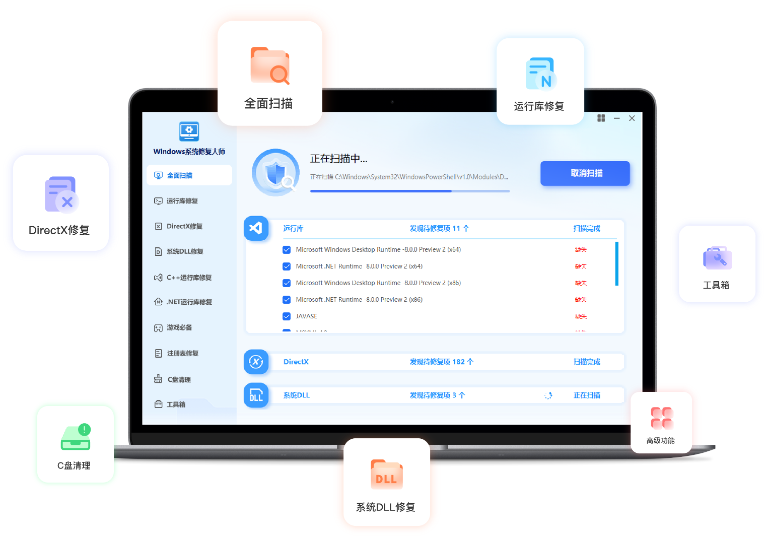 智能修复DLL缺失导致的电脑异常系统DLL组件和其他组件缺失解决软件运行异常、闪退等问题解决电脑开机异常、错误弹窗问题
